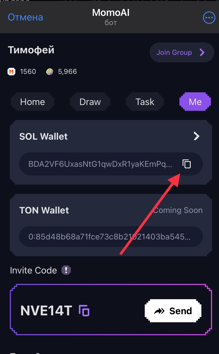 Me - Ваш кошелек Sol и рефферальный код.