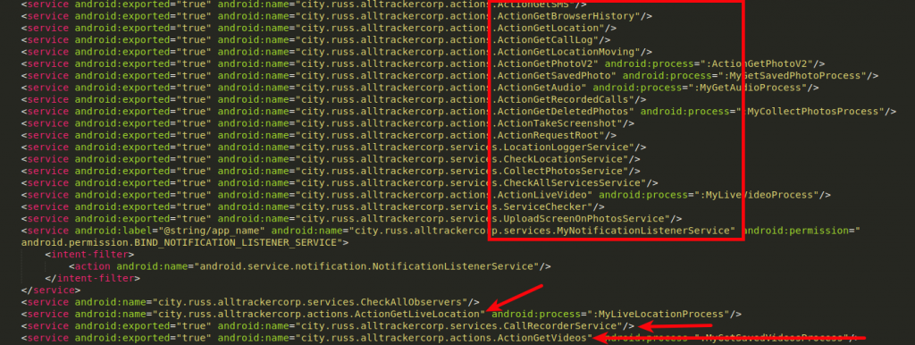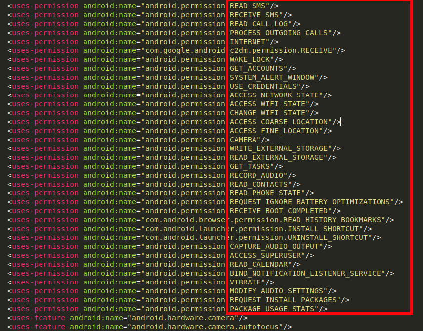 Полный функционал этого шпионского ПО можно увидеть в файле манифеста ниже.