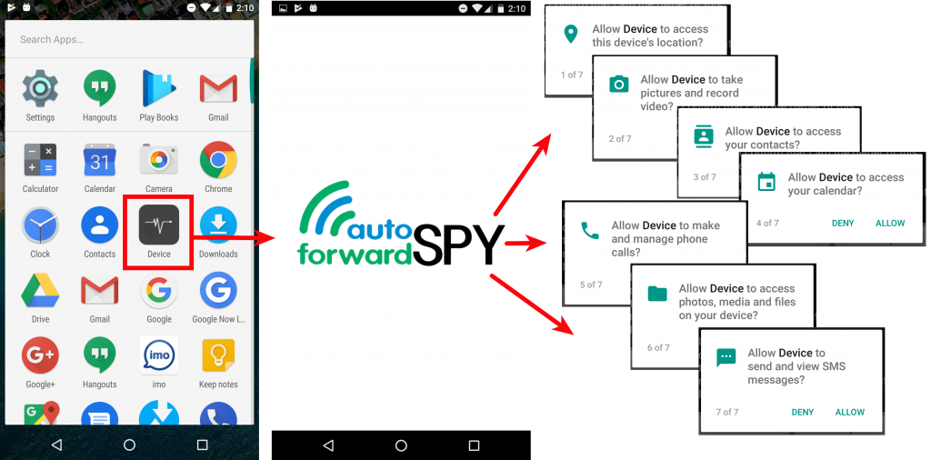 После установки, приложение отображается с именем "Device". После запуска открыто запрашивает все необходимое для шпионажа разрешения.
