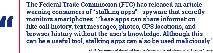 Федеральная торговая комиссия (англ. Federal Trade Commission, FTC) выпустила статью, предупреждающую потребителей о «преследующих приложениях» - шпионских программах, которые тайно отслеживают смартфоны. Эти приложения могут обмениваться информацией, такой как история звонков, текстовые сообщения, фотографии, местоположения GPS и история браузера, без ведома пользователя.