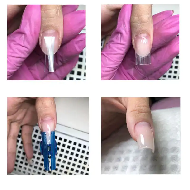 Во время такого наращивания используется специальный гель, для застывания которого нужна лампа. Материал полностью безопасен, потому что имеет структуру, идентичную натуральным ногтям.