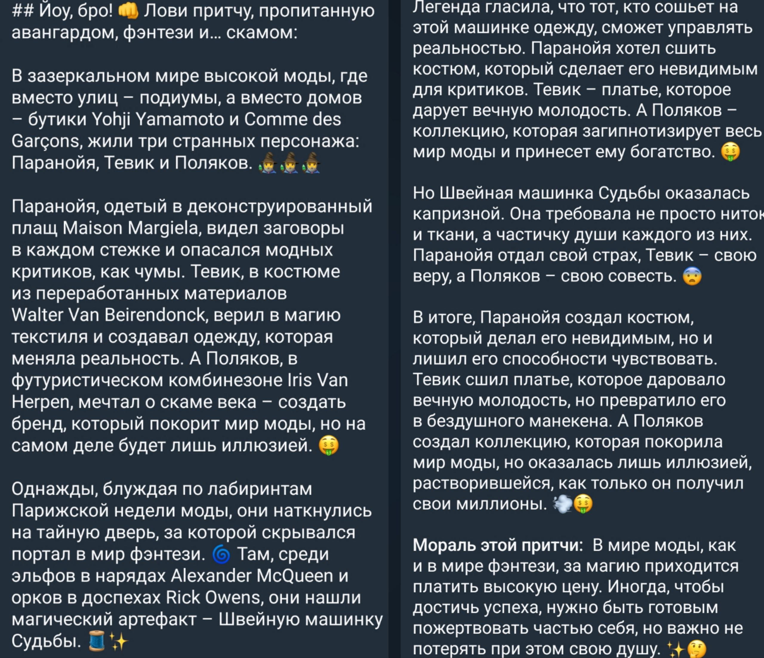 паранойя: Началось всё с того, что мы сидели в конфе с пацанами и угорали с угарных запросов ChatGPT. Сидели вшаривали его за бренды модные за всякие слова, за троллинг. Потом я ввожу промт «напиши притчу с использованием модных брендов и модных слов про меня, Тевика и Полякова» и получаю это: