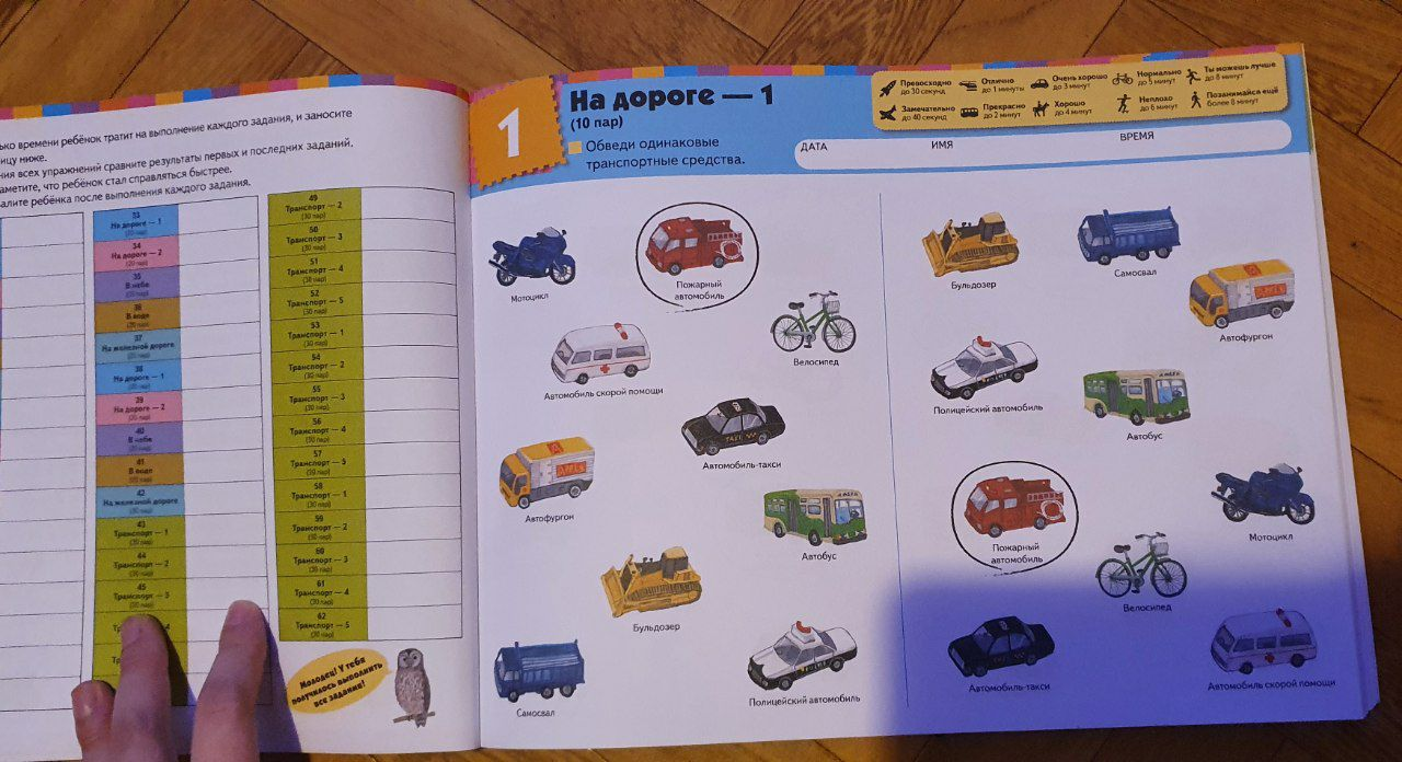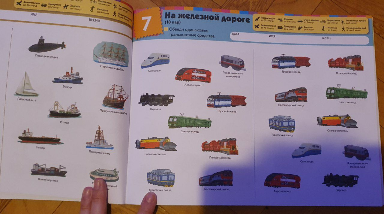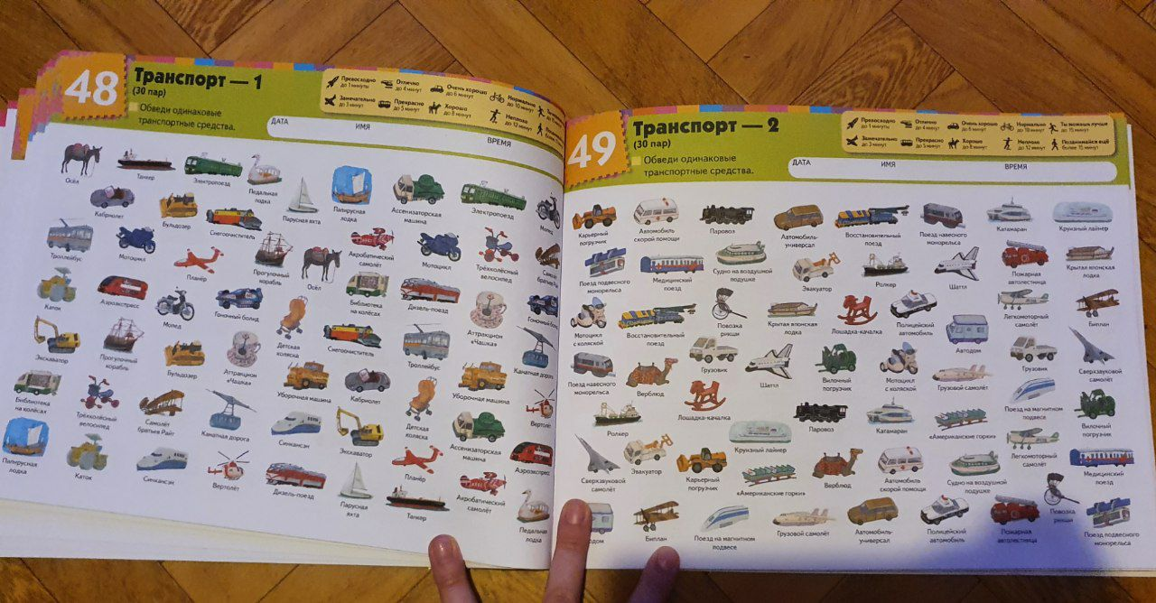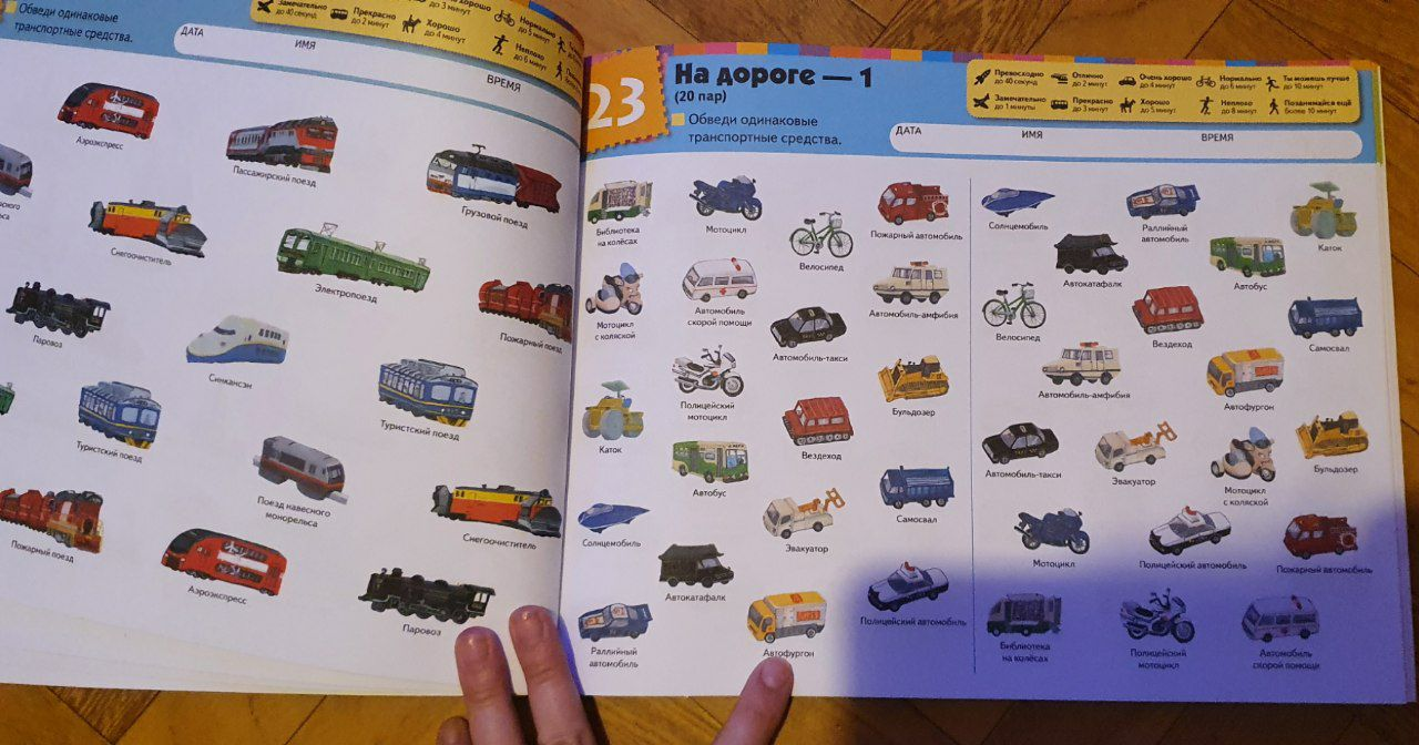— расширит словарный запас на тему транспорта. Каждая картинка в тетради подписана. После того как ребенок выполнит задание на поиск пар, вы можете назвать некоторые транспортные средства, показав на них пальцем. Так ребенок узнает новые слова, которые сможет использовать в речи.