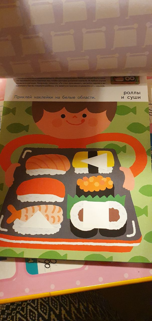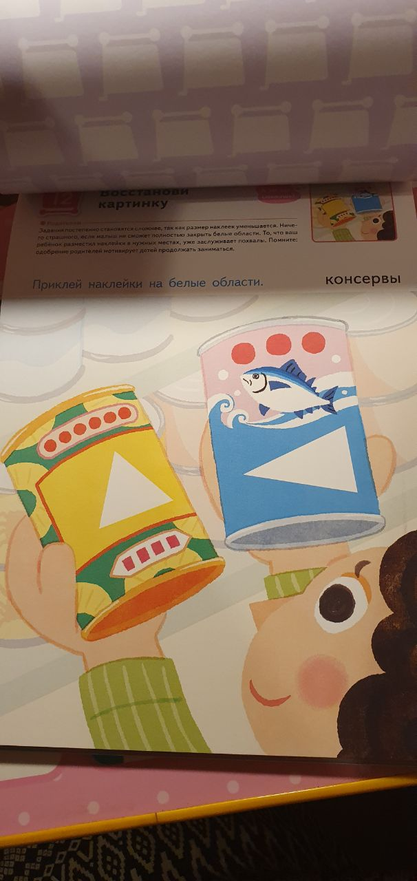 — разовьет пространственное мышление: нужно правильно повернуть наклейку в руках перед тем, как приложить ее к странице;