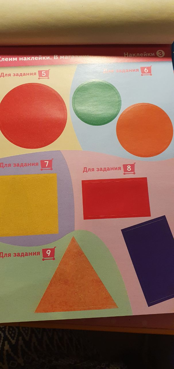 — потренируется различать геометрические фигуры и цвета, самостоятельно выбирая нужные наклейки;