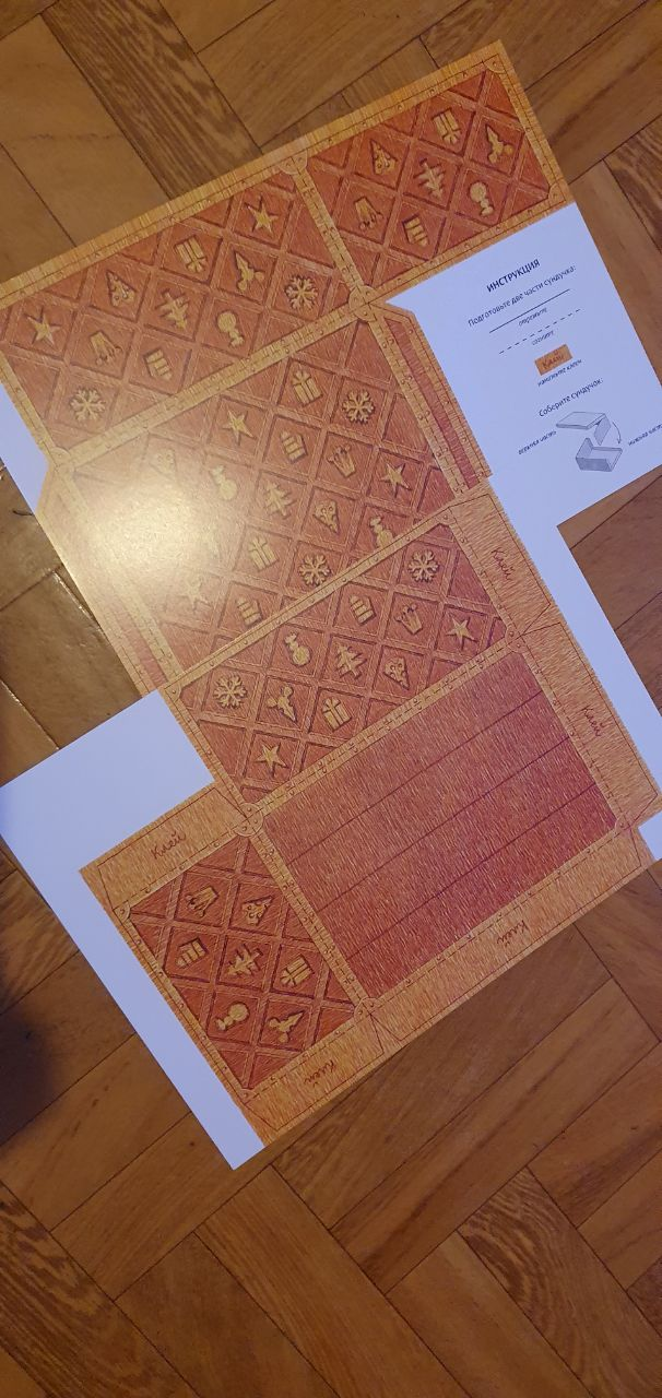 1. Игра начинается за 15 дней до Нового года, 17 декабря. К этому дню повесьте плакат из набора на стену и подготовьте 32 карточки. Вырежьте детали сундучка, согните их по пунктирным линиям и склейте в отмеченных местах.