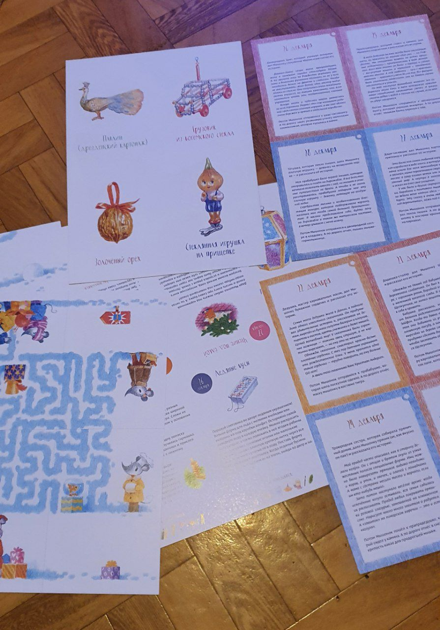 картонные листы, которые нужно разрезать на 32 карточки. На шестнадцати карточках на одной стороне будет изображена старинная игрушка, а на обороте — рассказ героя-мышки про эту игрушку, а также задание для ребенка. На других шестнадцати карточках вы найдёте задание или мастер-класс, а на обороте -- часть лабиринта, который нужно будет сложить в конце.