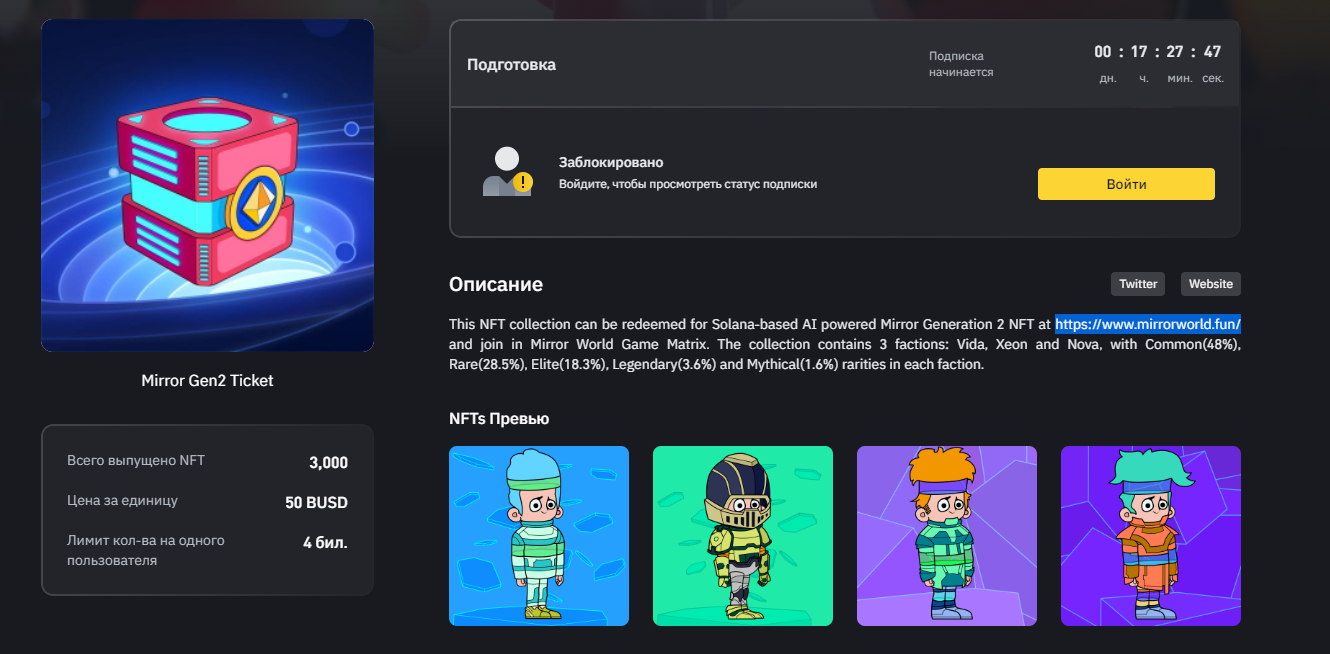Цена каждого из представленных к сейлу 3000 NFT составляет 50 BUSD. Один пользователь может купить не более 4 билетов.