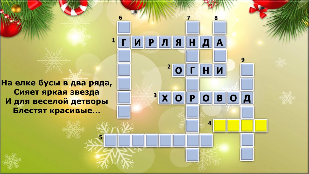Новогодний кроссворд №4 . Описание: Кроссворд про Новый Год! Новогодний кроссворд онлайн, разгадывайте и зарабатывайте очки . Разгадывали: 4088 раз . Самый Умный: OnOff со счетом 173 . Разгадывать . . .