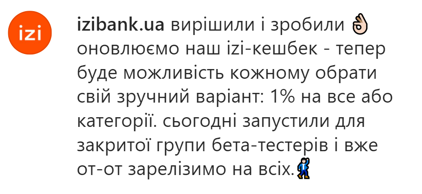 В izibank скоро можно будет выбрать либо 1% кешбэка на всё либо выбрать 2 категории с повышенным кешбэком: