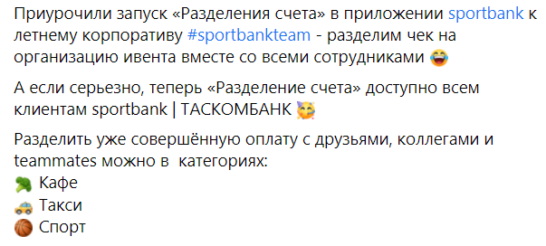 В приложении sportbank для клиентов ТАСКОМБАНК теперь доступно "Разделение счета".