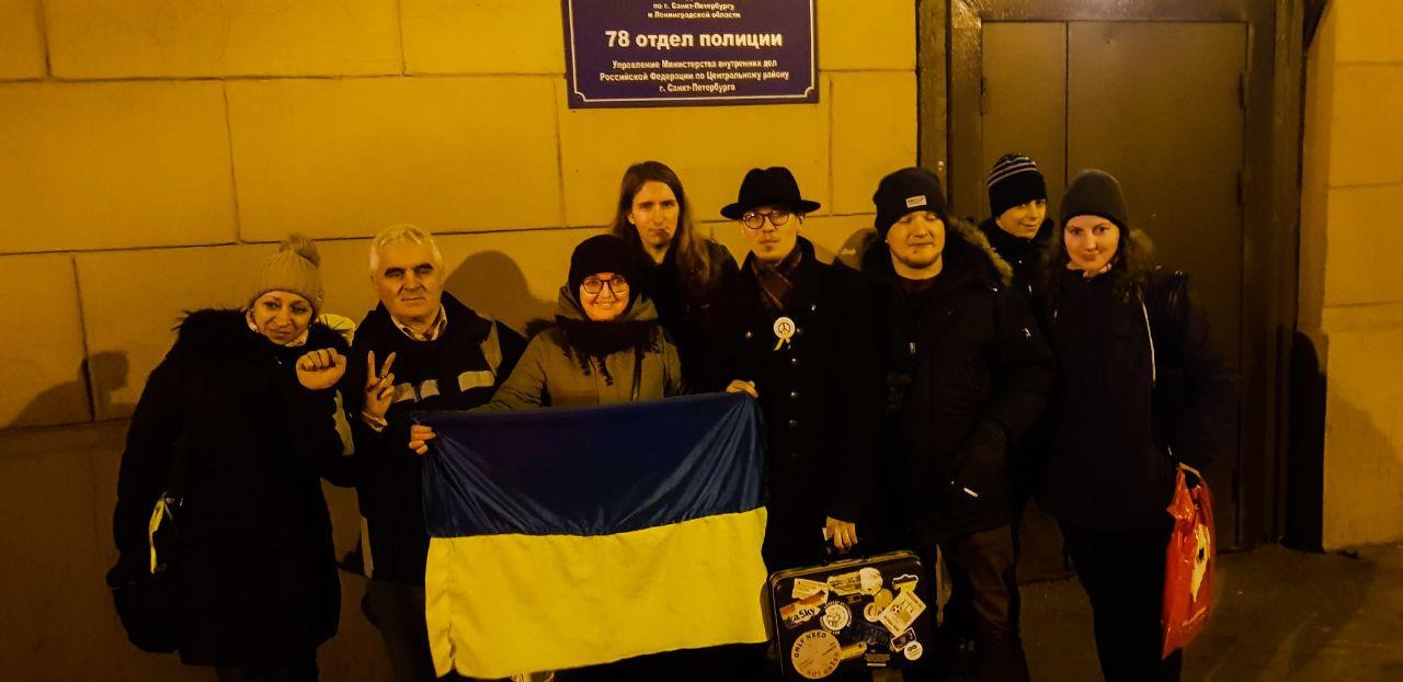 Задержали Александра Хмелева и Светлану Ковалец за украинский флаг и антивоенные плакаты. Задерживал Денис Воронов. Их везут в 78 отдел