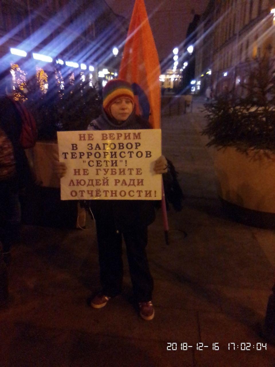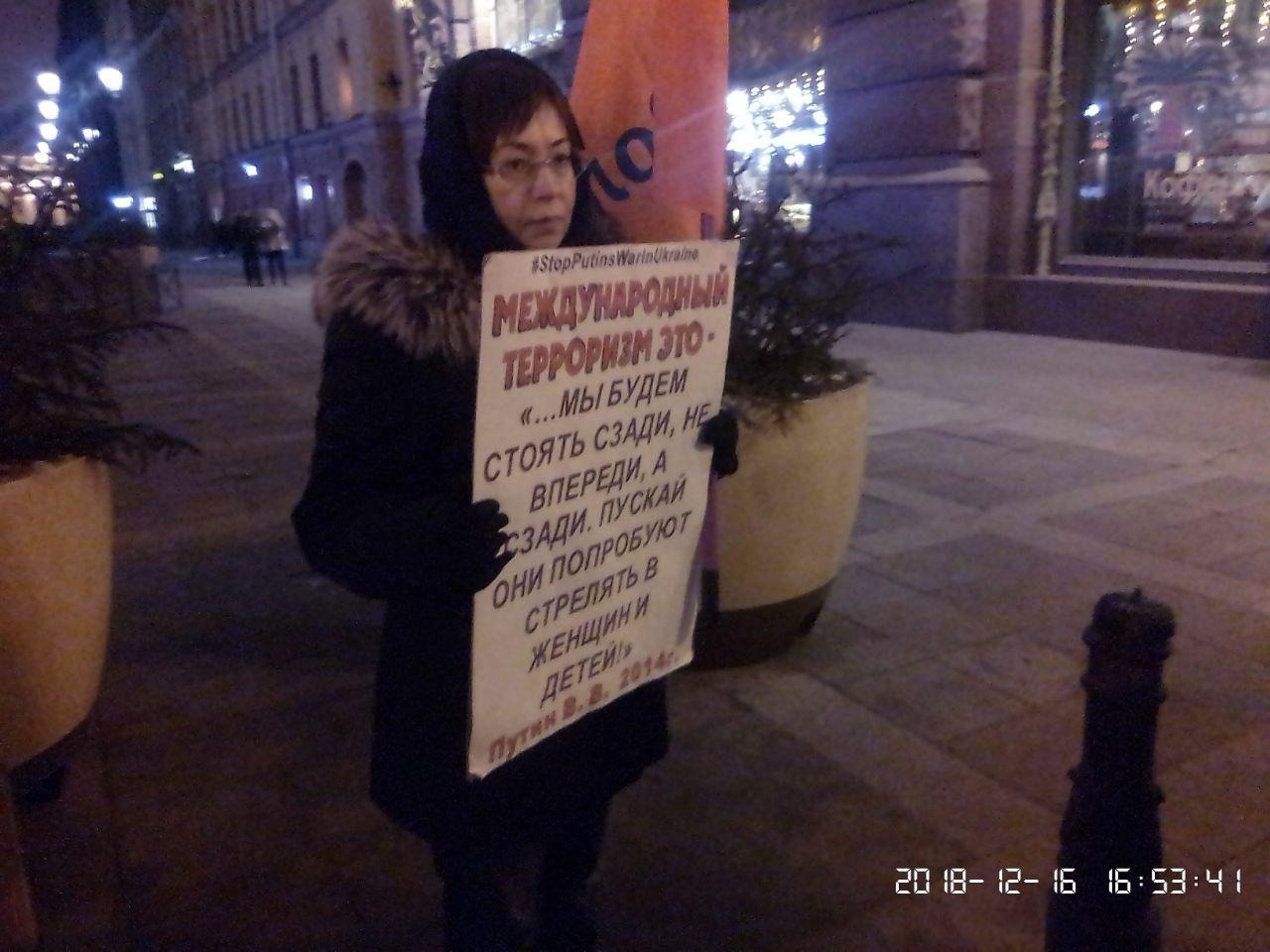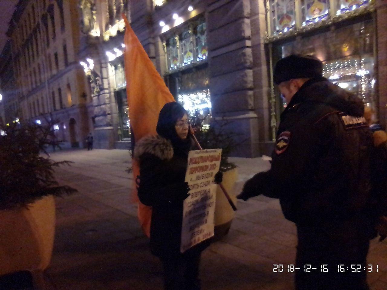 В Петербурге Александра Хмелева задержали во время одиночного пикета. Об этом ОВД-Инфо сообщила «Группа помощи задержанным».