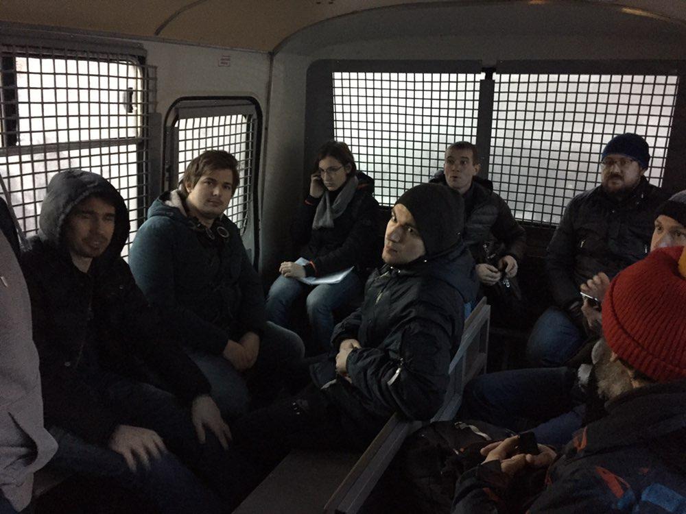 UPD 15:15 Полиция задержала Романа Лобачева, Дмитрия Иванова и одного несовершеннолетнего активиста. Их поместили в первый автозак, туда же перевели Гуда и Афанасьева. Автобус уже подъехал к отдел полиции по Мещанскому району.