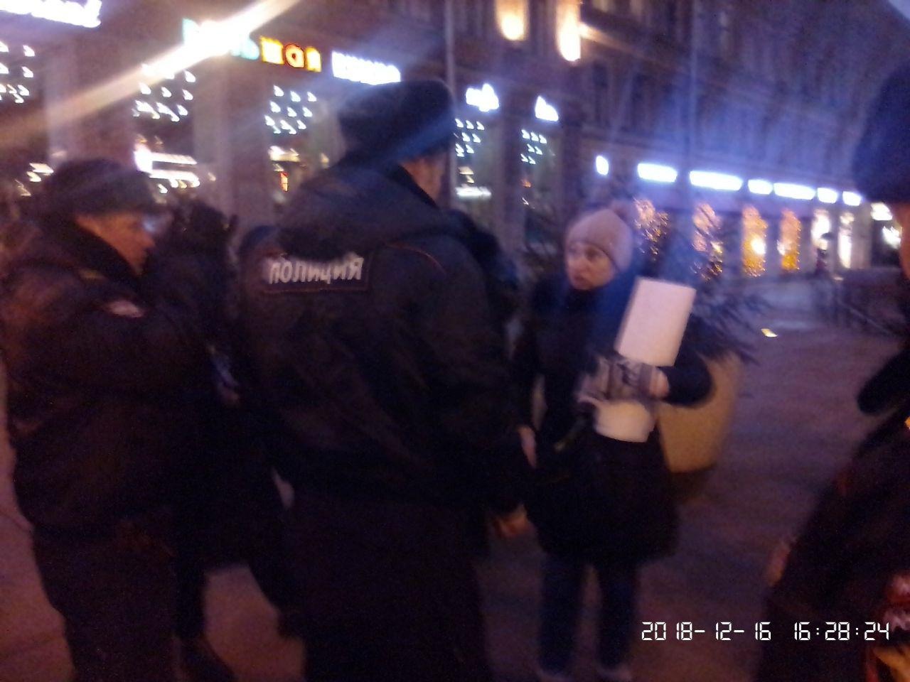 Полиция также задержала Светлану Ковалец, которая стояла в одиночном пикете с антивоенным плакатом.