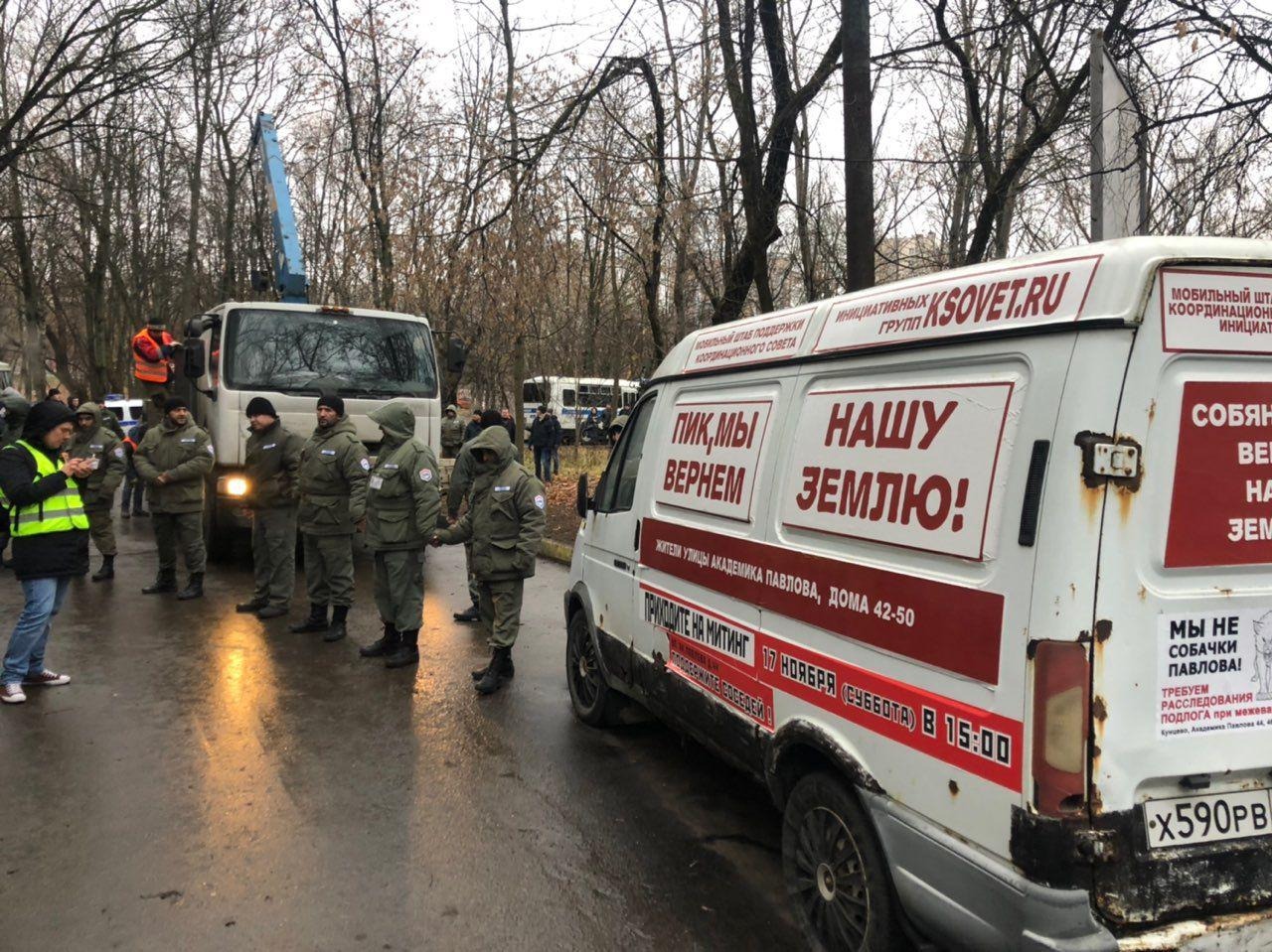 Утром 19 ноября в Москве в районе Кунцево на улице Ивана Франко 20, полицейские и ЧОП Группы ПИК, разогнали защитников сквера, а строители оперативно возвели забор вокруг запланированной стройки.