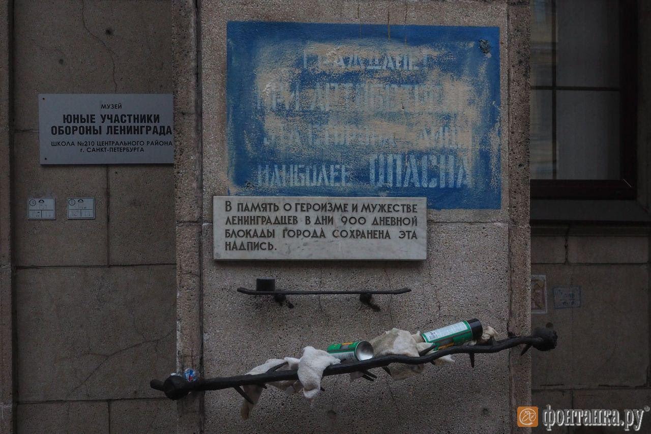 Предупреждение об опасности при артобстреле, оставленное на 14-м доме по Невскому проспекту в память о погибших во время блокады Ленинграда, второй раз за неделю приходится оттирать от краски. Директор ближайшей школы обратилась в полицию.
