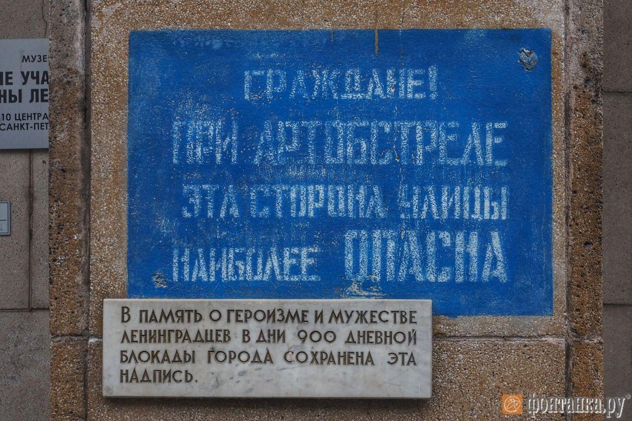 Надписи «Граждане! При артобстреле эта сторона улицы наиболее опасна» появились на фасадах зданий в блокадном Ленинграде в 1943 году. В настоящее время в Петербурге их три, еще две в Кронштадте. Эти надписи были воссозданы в 60-70-е годы, со времен Великой Отечественной войны предупреждений не осталось.