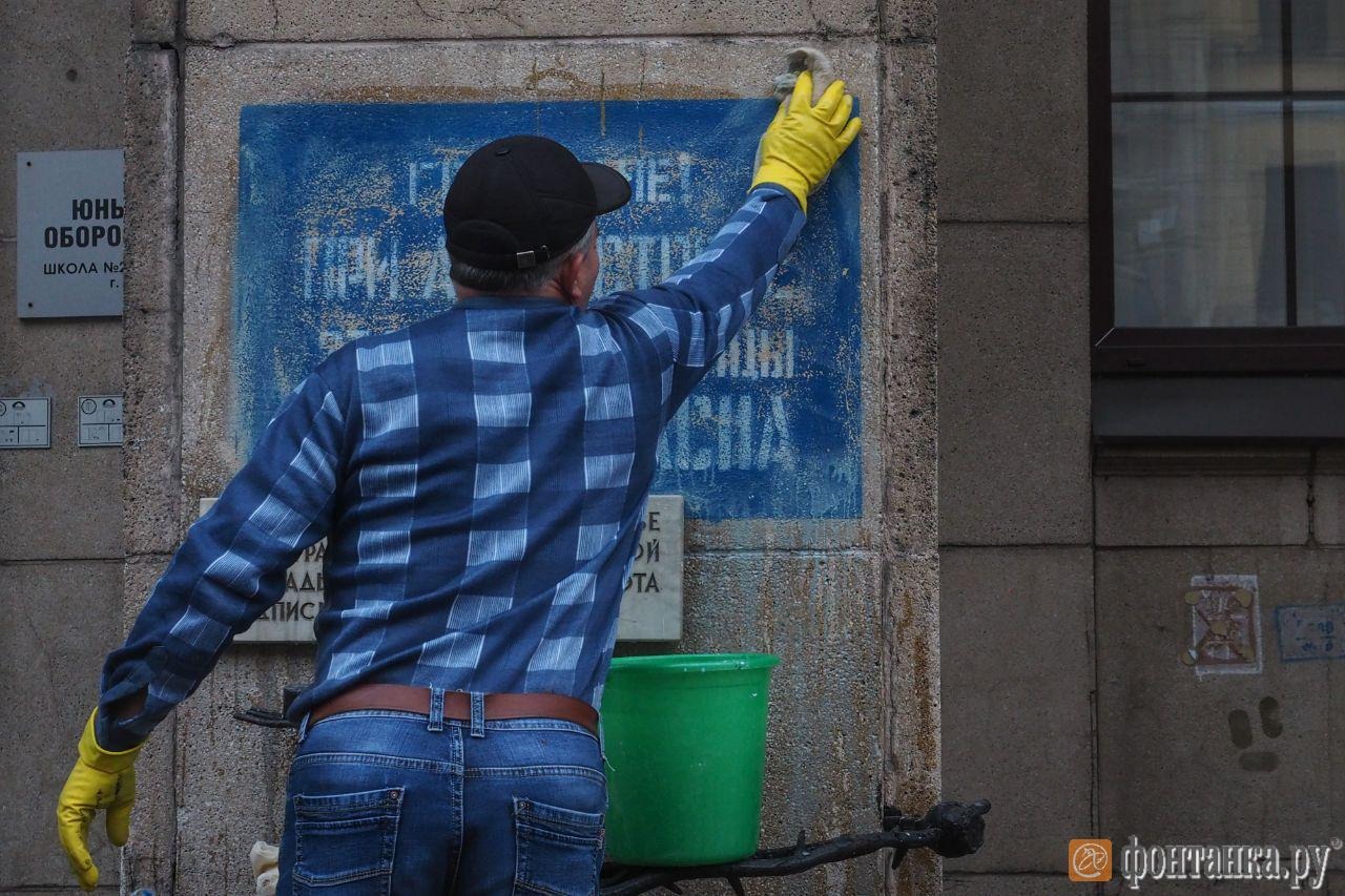 Краску отмывал сотрудник 210-й школы. Ему пришлось использовать растворитель, теперь надпись в память о погибших во время блокады Ленинграда придется обновлять.