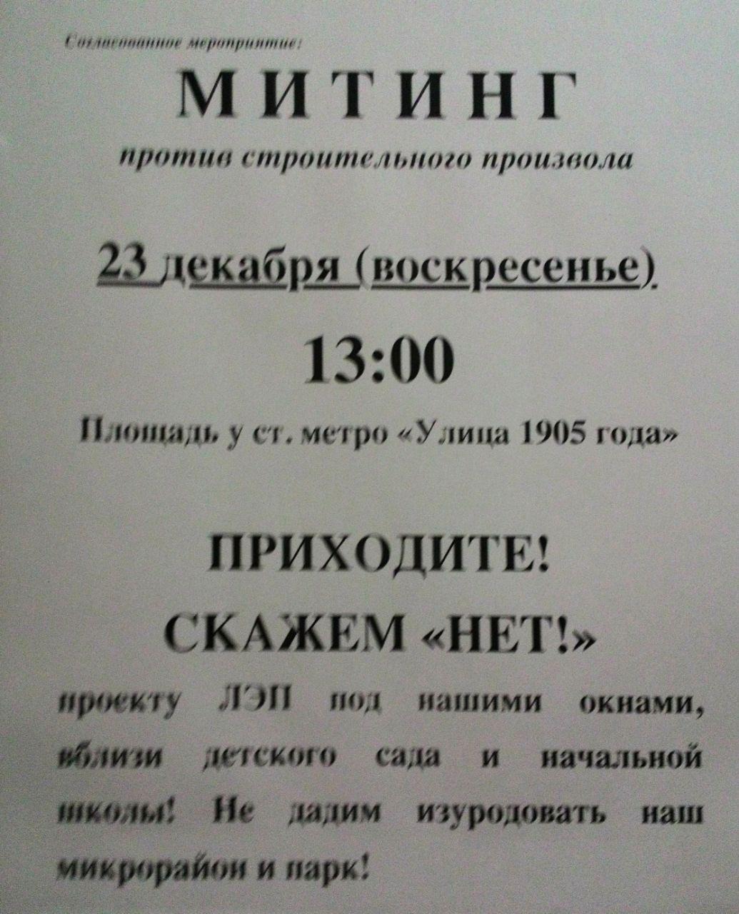 Не был уверен, стоит ли звать вас на митинг против строительного произвола, но сегодня увидел листовку у себя в подъезде и отбросил сомнения — раз организаторы за свой счёт занимаются активной агитацией, то их мероприятие несомненно стоит посетить. Воскресенье, Улица 1905 года, 13 часов. Приходите сами и приводите друзей. Фото делал на тапок, новый телефон ещё не купил, так что извиняйте за картинку.