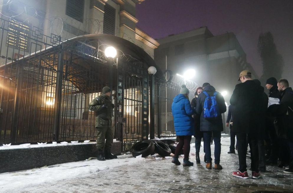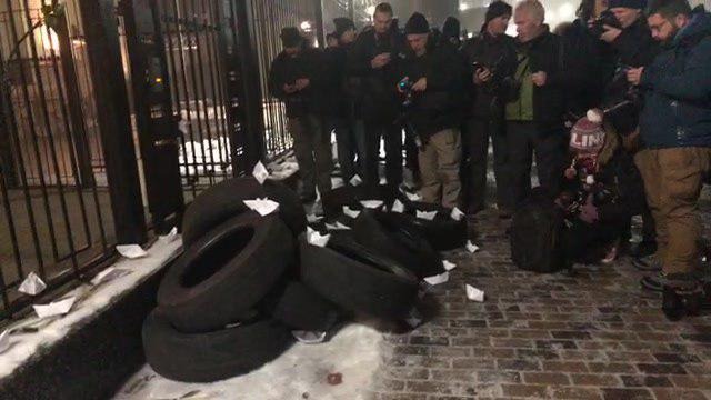 Под посольство РФ в Киеве принесли покрышки и собираются люди.