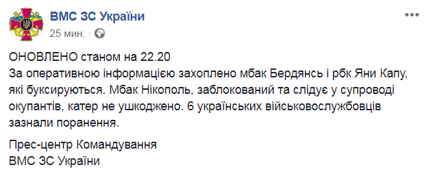 К вечеру 25 ноября пресс-центр командования ВМС Украины сообщил, что в итоге столкновения с российскими пограничными кораблями ранены шестеро украинских военных, захвачены российской стороной катер «Бердянск» и буксир «Яни Капу», а катер «Никополь» заблокирован российскими судами.
