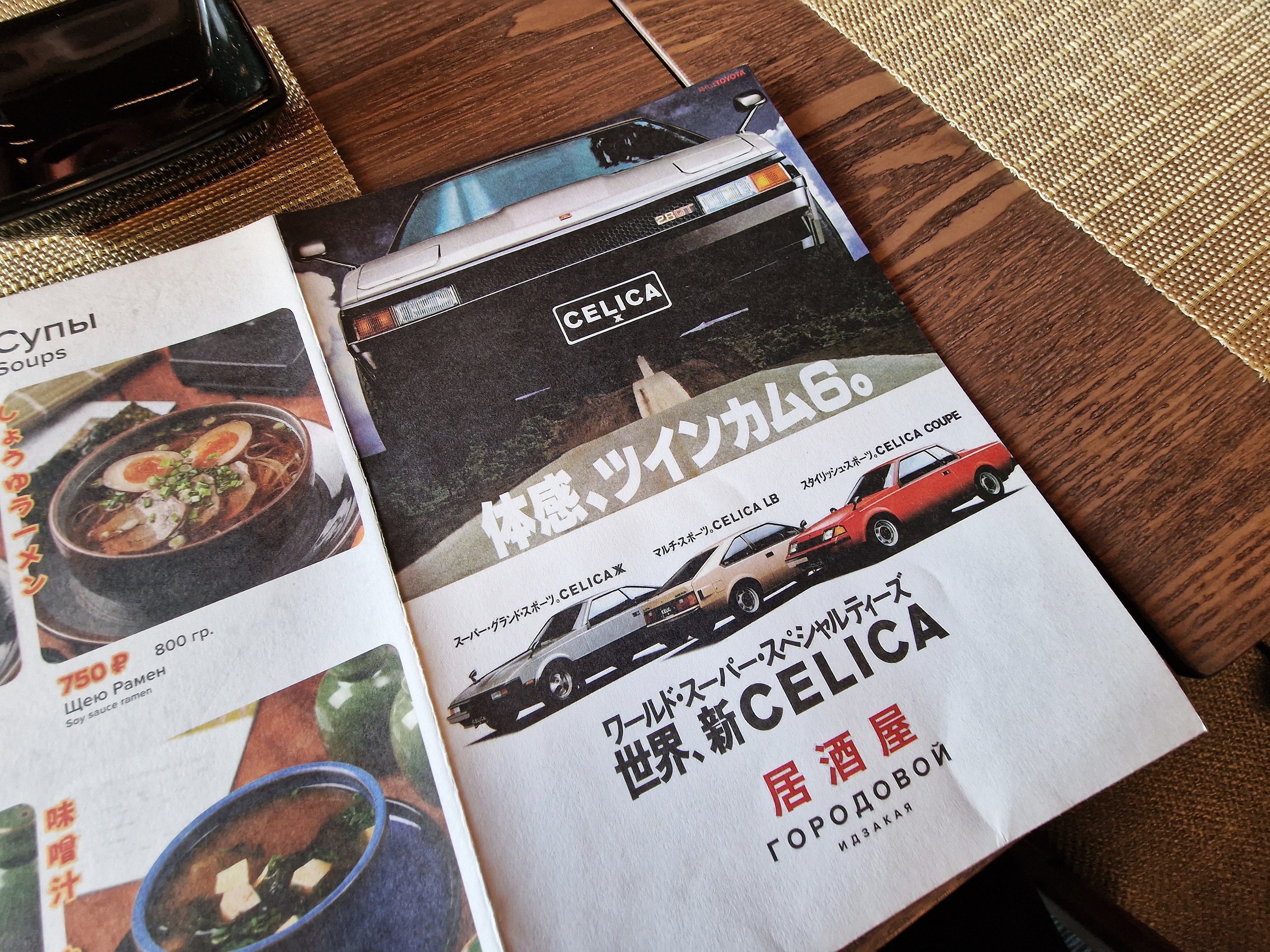 Меню небольшое (сделанное в виде свернутого в несколько раз большого ретро-плаката с японским автомобилем), но выбор есть: сашими, суши, гунканы, роллы классика и нью вейв, закуски, шашлычки и супы.