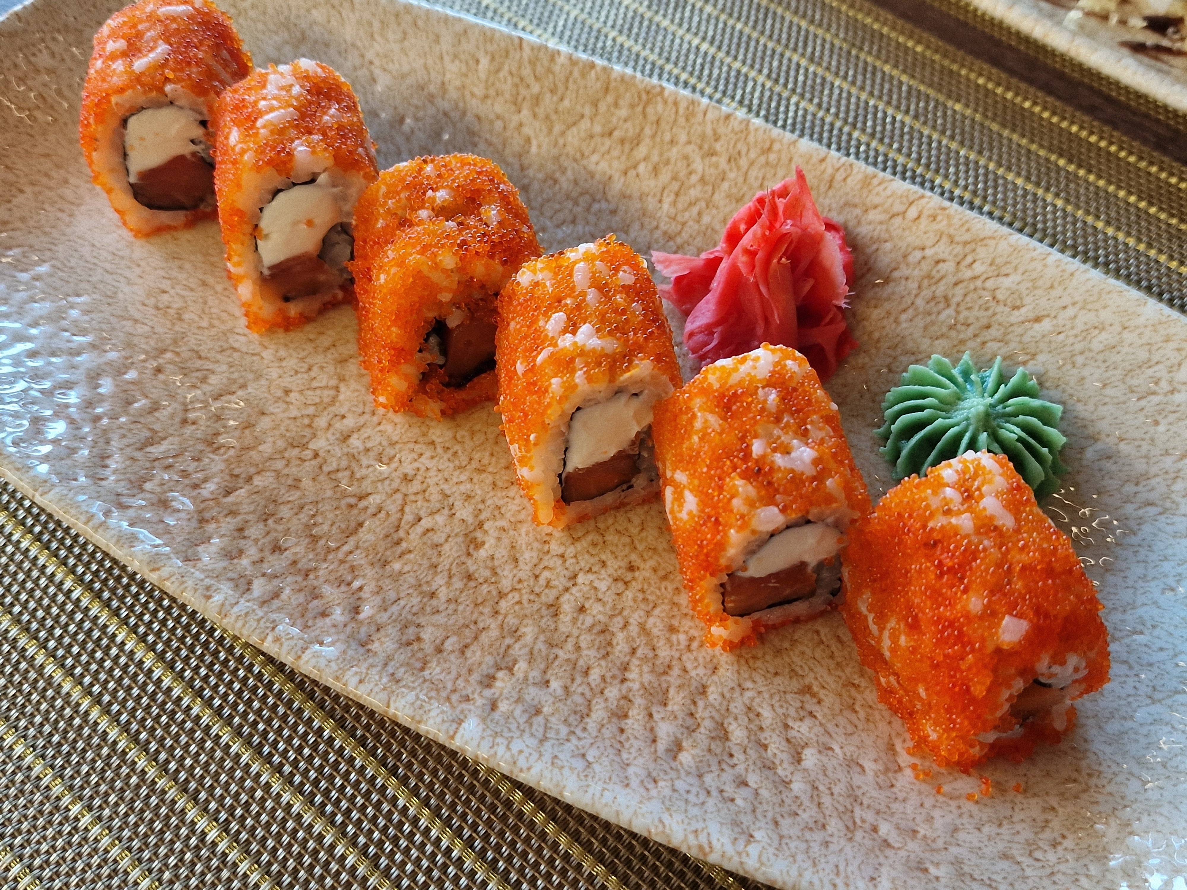 По виду принесли классическую маленькую, хуево скрученную, обваленную в тобико "Калифорнию". Но нас уверили, что это фила.