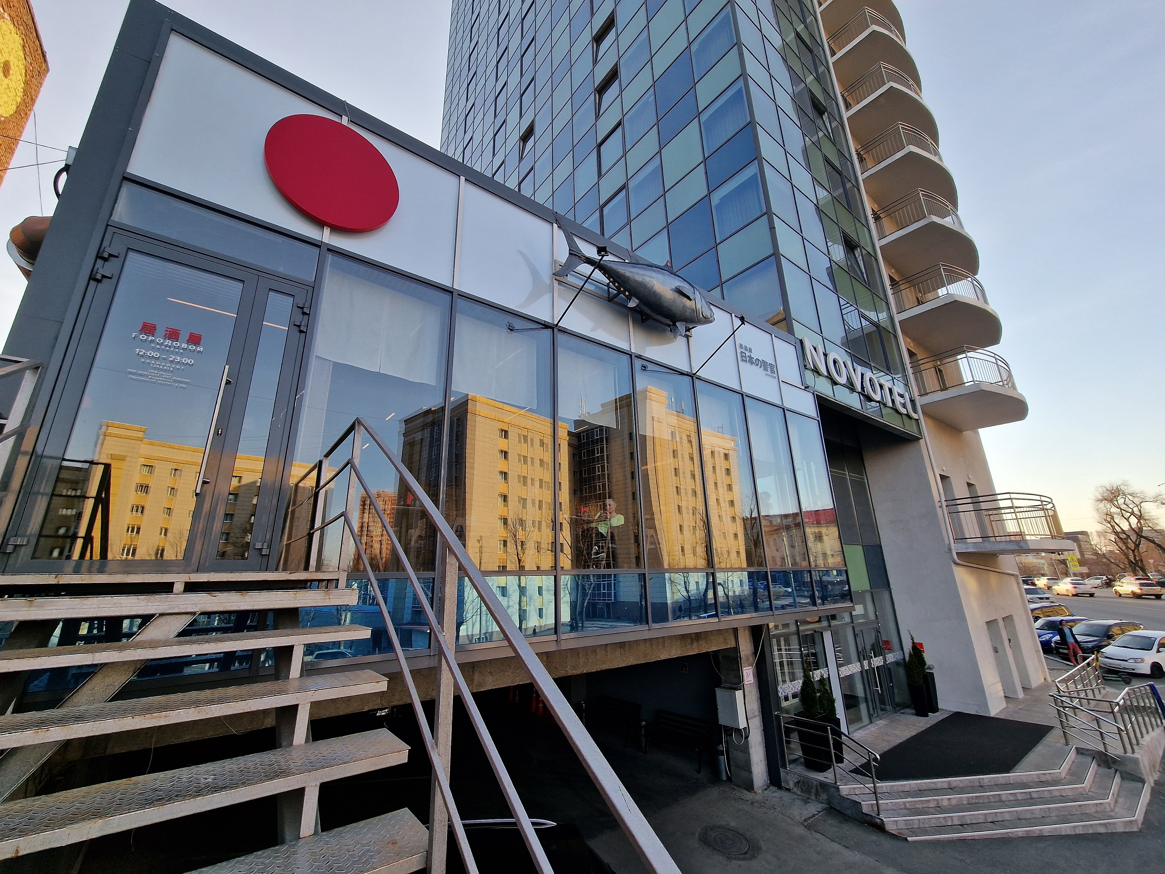 На фасаде расположен огромный синеперый тунец и красный круг, символизирующий солнце, Японию, красный, круг и т.д.! Вот в принципе и вся красота экстерьера, да и интерьера вместе.