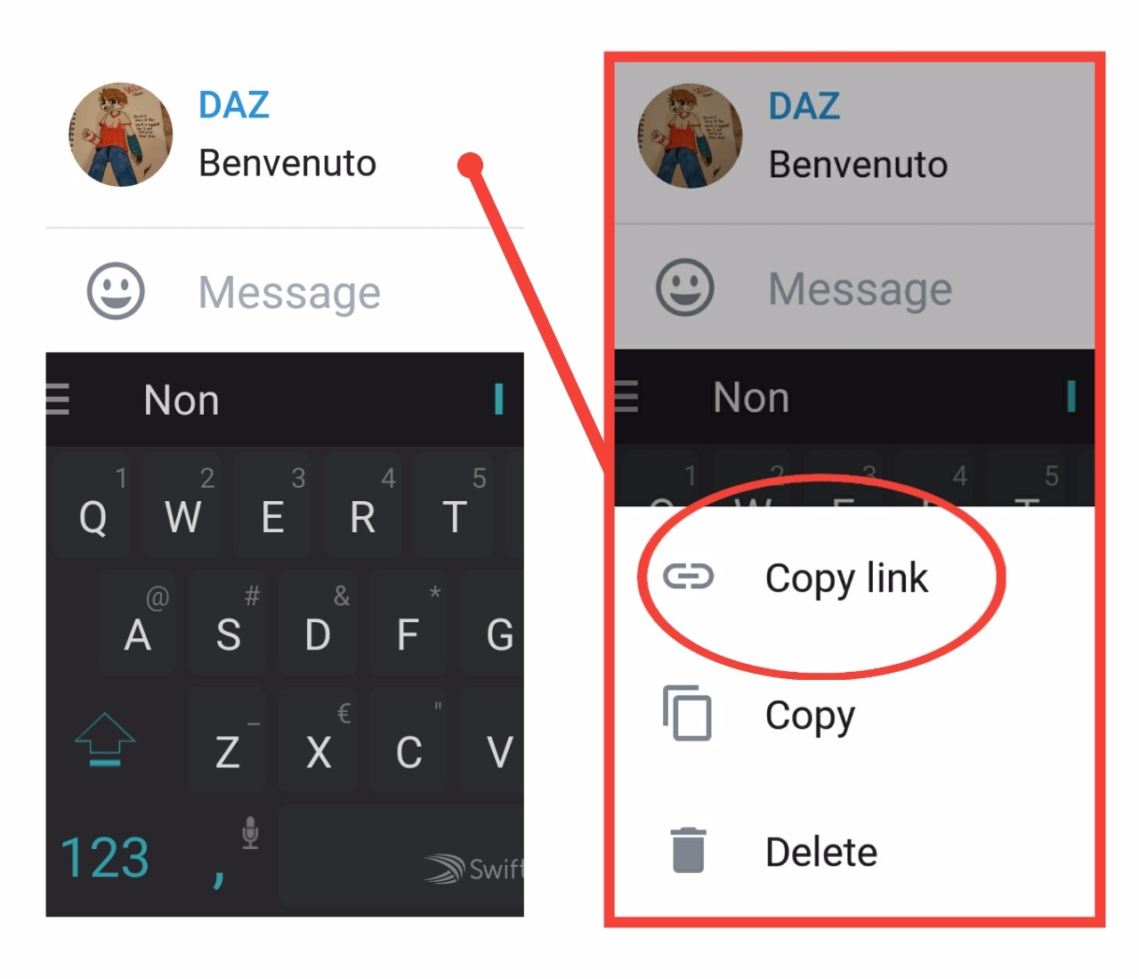 In questo caso basterà tappare sul messaggio, e andare a selezionare "Copy link" sul piccolo menù che si verrà a creare in basso.