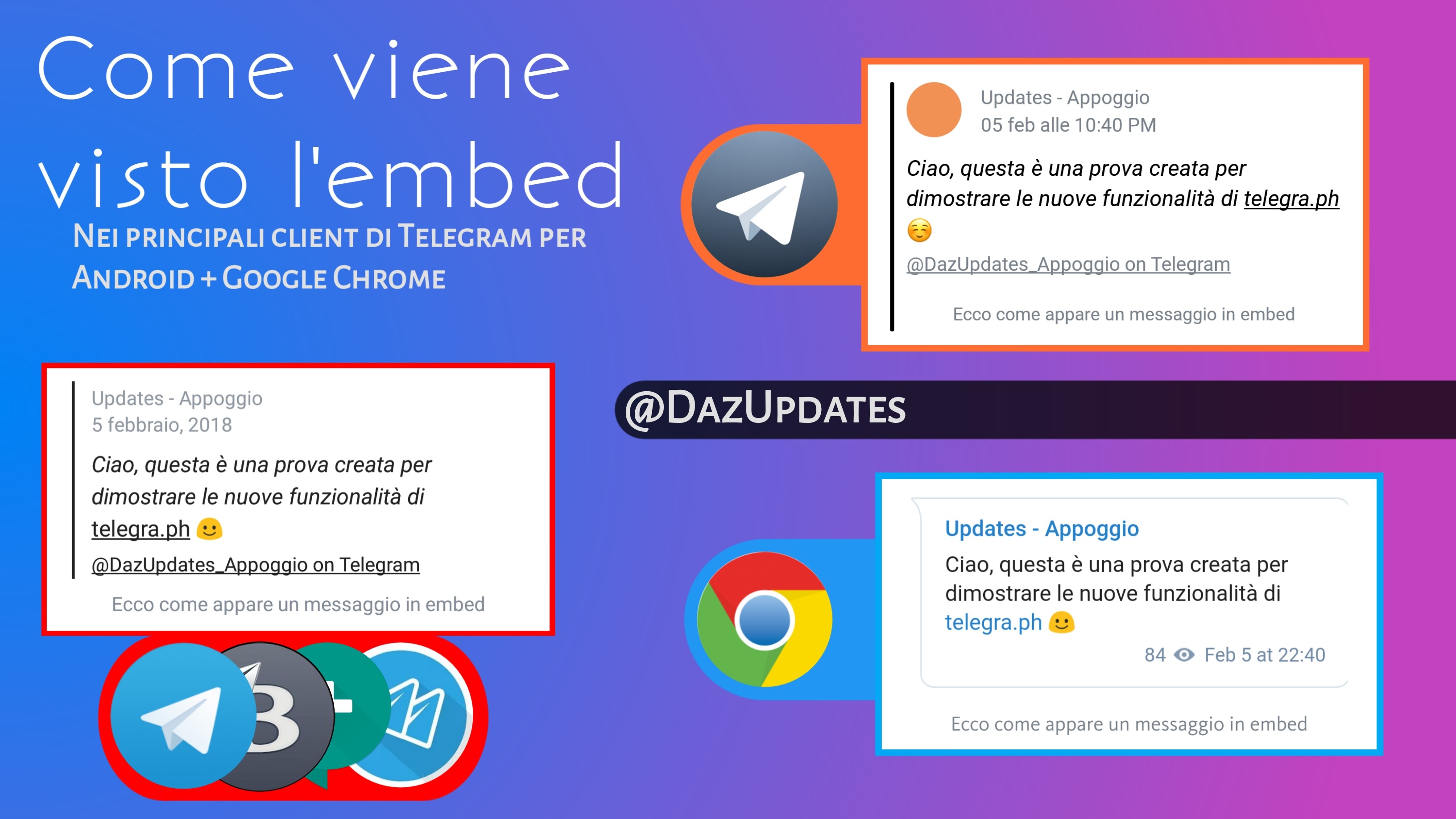 È anche necessario spiegare che a seconda dell'applicazione che stiamo utilizzando, cambia la visualizzazione del messaggio incorporato. Di seguito abbiamo raccolto le visuali da Telegram Stock, Telegram X, Chrome, Plus Messenger, Mobogram/OTIgram e BiftoGram.