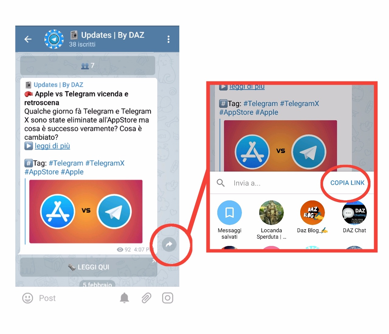 Per inserire un messaggio all'interno di una pagina bisogna ottenere il link del messaggio interessato (questo è possibile solo in canali e supergruppi pubblici), vediamo come.