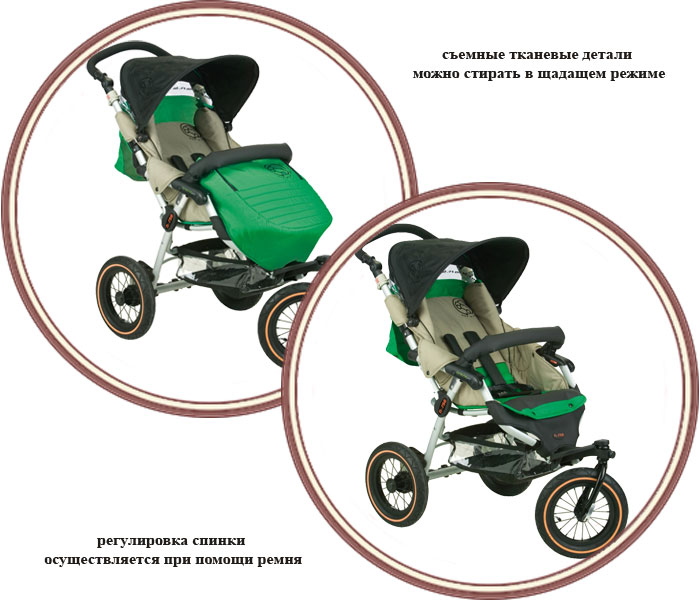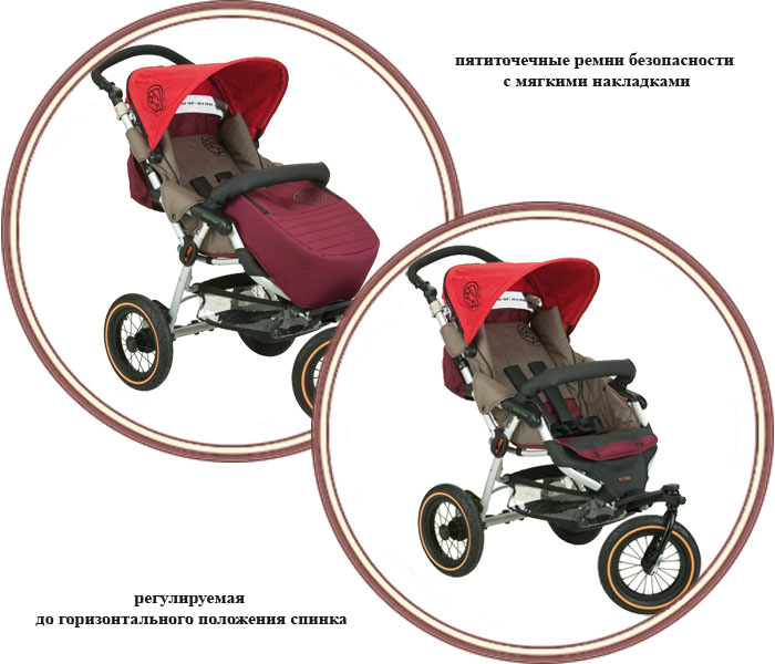Благодаря большим надувным колесам с протекторами, коляска легко проедет по плохим дорогам.