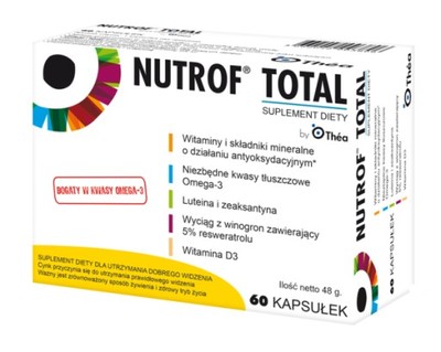 НУТРОФ ТОТАЛ / NUTROF TOTAL капс .х30 състав: рибено масло /Омега-3/, кристален FloraGlo лутеин /100% поглъщателна способност/, зеаксантин, екстракт от Vitis Vinifera, ресвератрол, витамини Е и С, мед, цинк и селен . НУТРОФ ТОТАЛ капс .х30 се предлага в Apteka .puls .bg на цена от 25,50 лв .