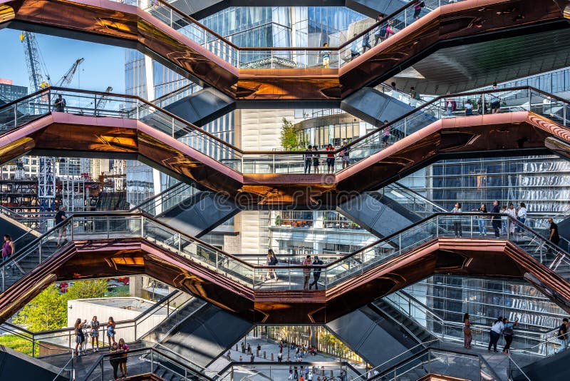 Что такое Vessel: В переводе с английского «Сосуд» представляет собой металлическую конструкцию высотой в 46 метров, больше всего напоминающую улей . 80 видовых площадок размещенные в «сотах», соединены друг с другом 154 лестничными пролетами . Разработал дизайн новой нью-йоркской достопримечательности британский архитектор Томас Хизервик .