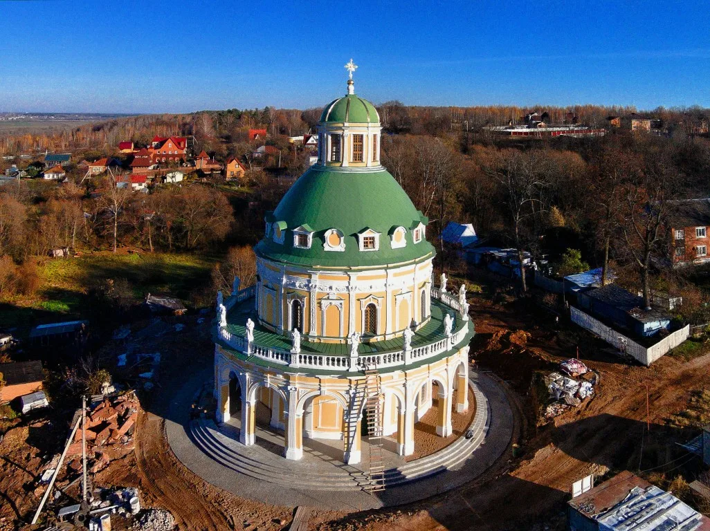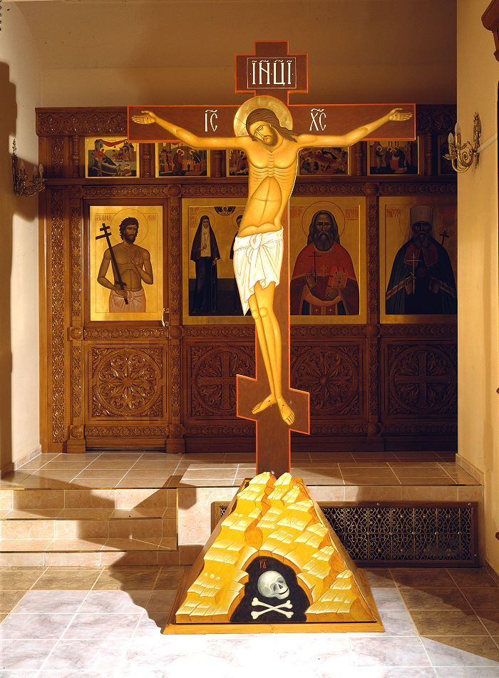 Также бывают храмы в виде креста. Крест Христов — основа Церкви, Крестом человечество избавлено от власти диавола, Крестом открыт вход в потерянный прародителями Рай.