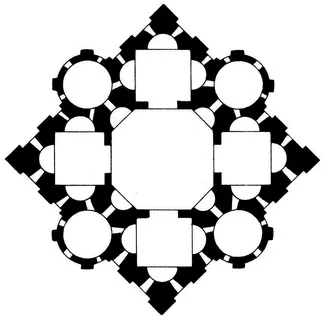 В виде восьмиконечной звезды. Вифлеемская звезда - звезда приведшая волхвов к месту, где родился Христос. Церковь, подобно звезде, свидетельствует о своей роли путеводительницы ко Христу и вечной жизни.