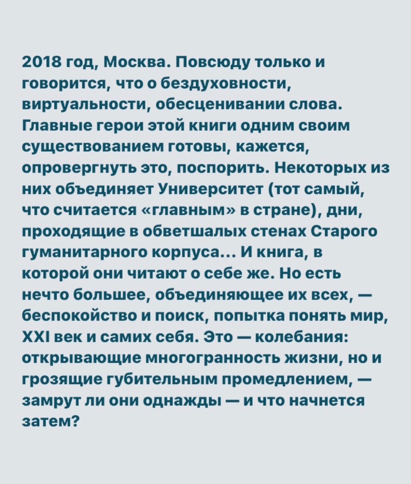 Она в том числе про Университет (aka москоу стейт юниверсити) / факультет (aka филфак, как вы уже могли догадаться); там есть герои, прототипы которых для кого-то могут быть легко узнаваемы, а есть и полностью вымышленные персонажи (если такие бывают вообще).