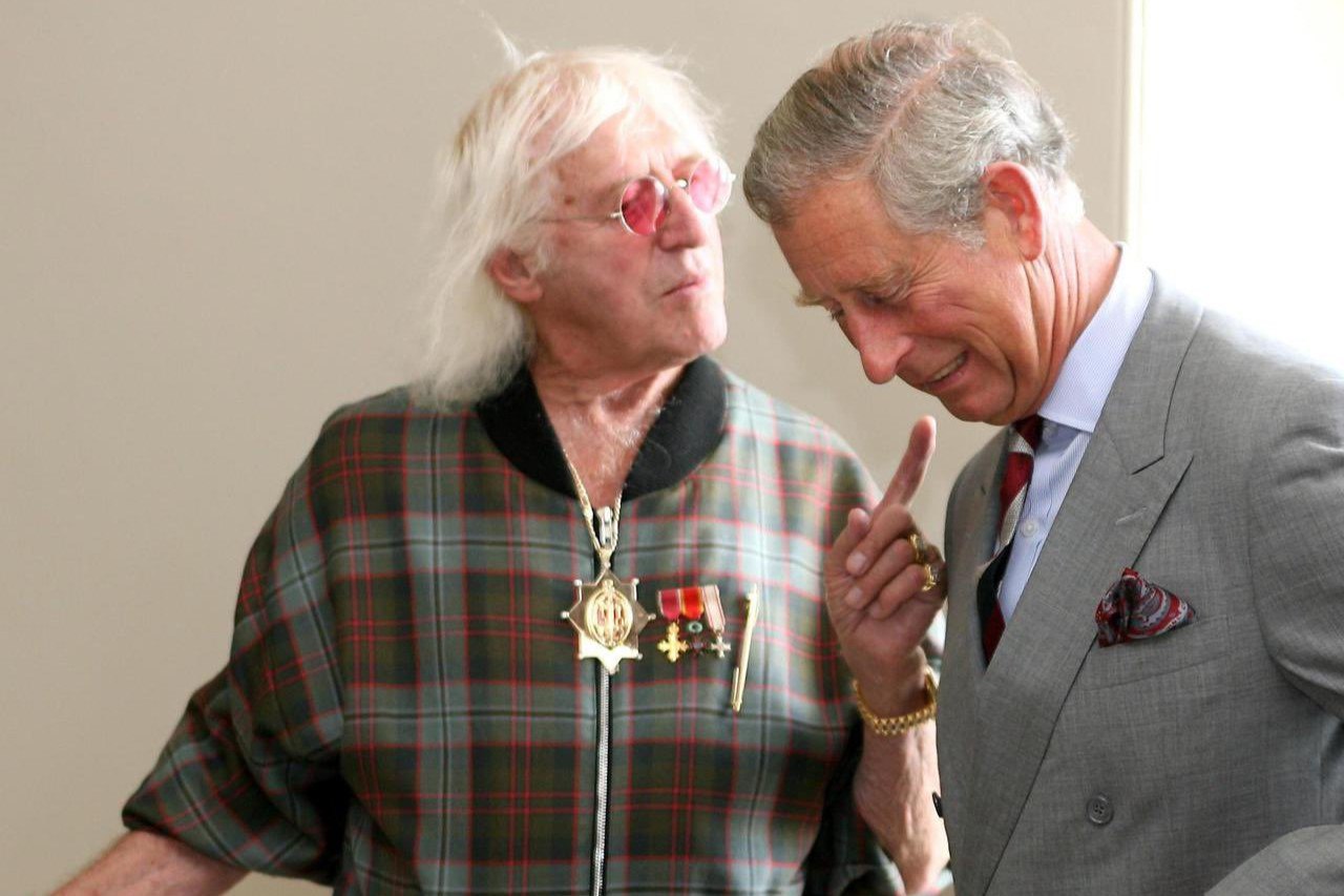 Savile teria conhecido pessoalmente o rei Carlos, quando ele ainda era príncipe, nos anos 70 do século XX, em eventos de caridade. Mas ele rapidamente teria se tornado surpreendentemente íntimo da família real, atuando como conselheiro em inúmeros temas. Segundo Diana, Carlos à época via Savile quase como um guru, um mentor. Savile chegou a dizer, porém, que ele conhecia a família real britânica há ainda mais tempo, desde os anos 60; tendo sido introduzido nos negócios da família real pelo lorde Louis Mountbatten, ex-governador de Burma…e notório pedófilo com predileção por menininhos.