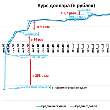 В 1992 году рубль девальвировался в 253 раза.