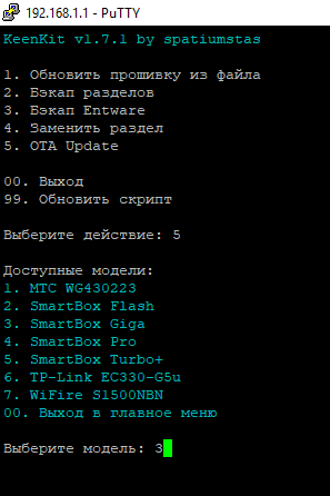 Для выбора функции OTA UPDATE нажимаем цифру 5, затем ENTER