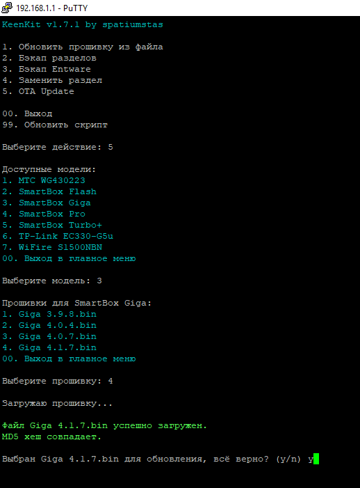 Выбираем нужную прошивку, нажимаем НУЖНУЮ цифру, затем ENTER