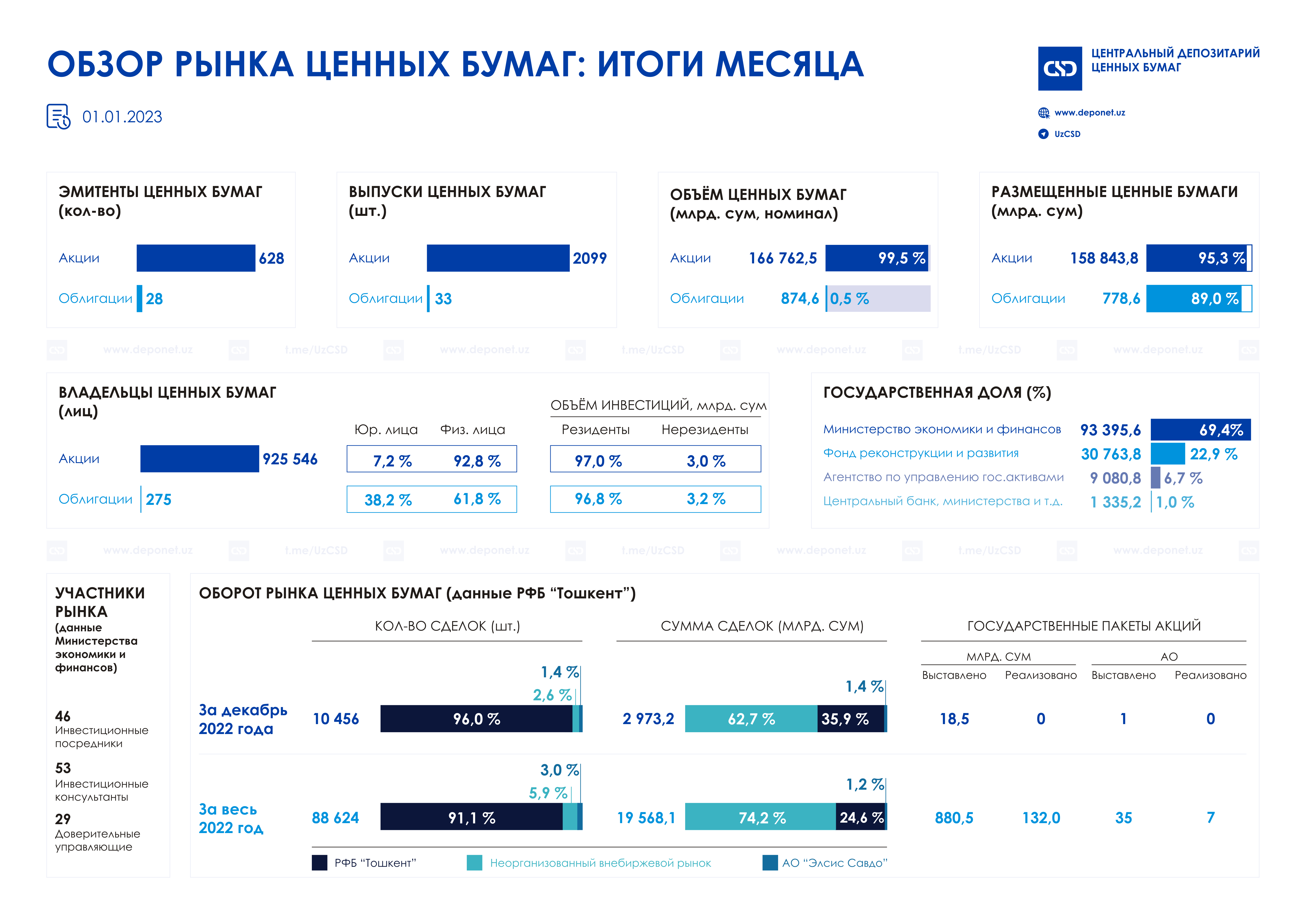Краткий обзор статистической информации по итогам декабря 2022 года по основным показателям Центрального депозитария, а также статистические данные по объемам биржевых и внебиржевых торгов.