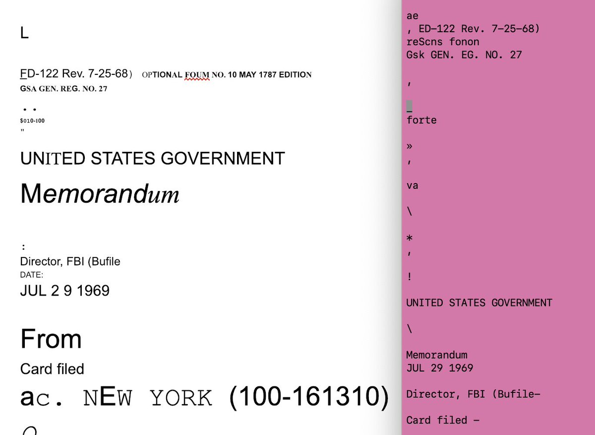 В один прекрасный день я швырнула одним из уродливых ФБР-овских документов в распознаватель Google OCR. Слева результат от Гугла, справа - распознано Tesseract-ом. Один и тот же документ, но такие разные результаты.