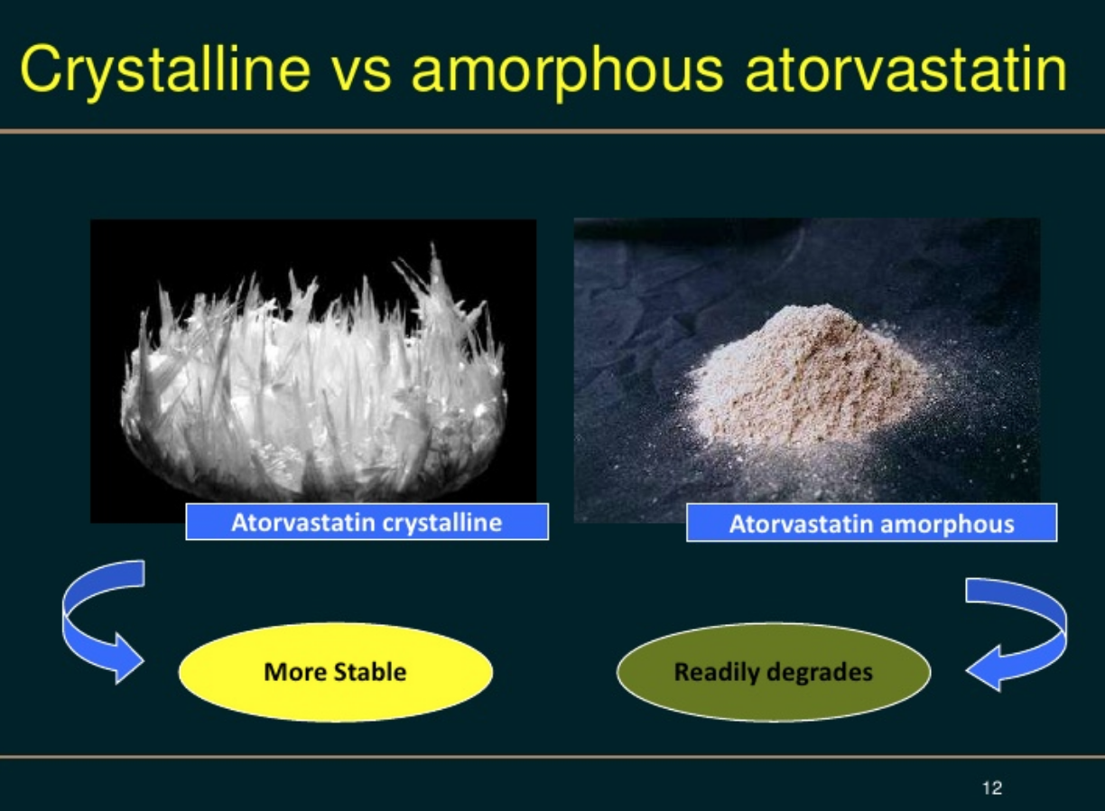 Глобальный патент Pfizer на исключительное производство Липитора закончился лишь 30 ноября 2011 года и другие компании получили возможность законно производить и продавать дженерики. Загвоздка в том, что, учитывая ошеломляющий успех аторвастатина, в мире уже с конца девяностых принимались попытки воспроизвести этот препарат. Лекарственные средства с действующим веществом «кальциевая соль аторвастатина» существовали ещё задолго до истечения всемирного патента. Дело в том, что аторвастатин в этих препаратах был представлен в аморфном виде, в то время как оригинал имел кристаллическую форму. И в одном, и в другом случае — одно и то же вещество. Но разница между кристаллическим и аморфным вариантами веществ может давать колоссальную разницу в свойствах. Для наглядности, алмаз — кристаллическое строение, сажа — аморфное, в обоих случаях — углерод.