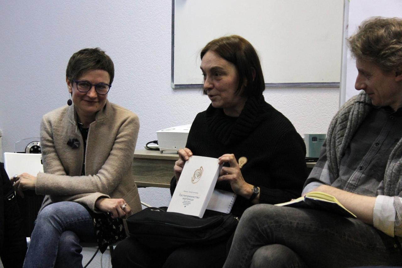 Но помимо знакомства с инициативами Минска и Санкт-Петербурга, произошел и литературный обмен. Так, Алла Митрофанова представила книгу Ирины Аристарховой “Гостеприимство матрицы” (автор вступительной статьи Алла Митрофанова, автор иллюстраций Анна Терешкина), которую она вручила Ольге Шпараге.
