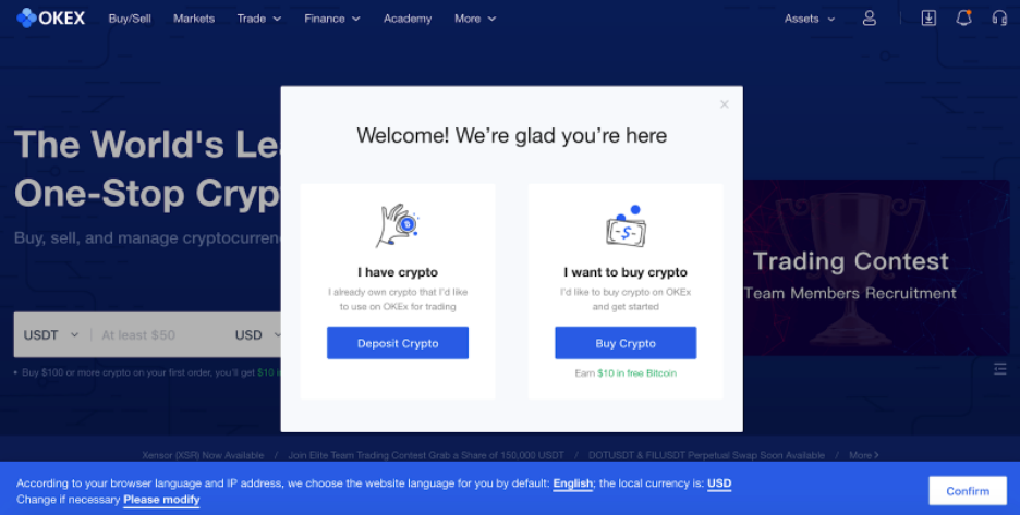 Once you enter the code and verify your email address or phone number, you will be logged into your new OKEx account and will be greeted with a welcome screen.