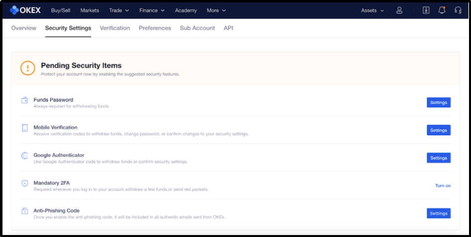 All OKEx users are encouraged to take advantage of the various security measures and features provided by the exchange. You can start reviewing these options by either clicking on Security Settings on the top menu bar or the security suggestions prompt on the Overview section.