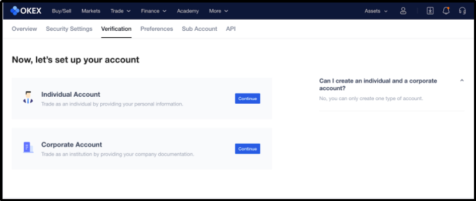 Depending on your account type, you can proceed either as an individual or a corporation and will be required to submit relevant information and follow all the steps. When verifying your account as an individual, you are typically required to have a government-issued identification document (usually your passport) on hand.