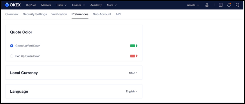 The Preferences screen also gives you the option to change the color scheme for the trading quotes you see on OKEx.